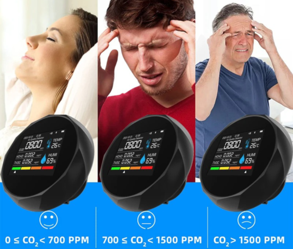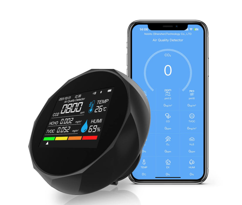 Monitors CO2, HCHO and TVOC levels, along with temperature and humidity, providing clear color indicators on an easy-to-read display. Includes a simple app to track and record air quality data, supporting a healthier indoor environment.